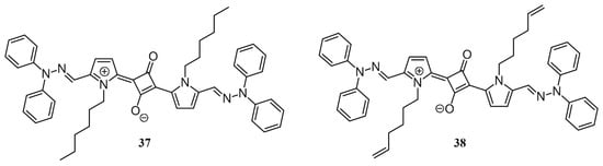 Facchetti et al. studied how subtle pi-core substituent variations affect photovoltaic responses of functional chromophoric systems [64]. In 2010, they have reported the synthesis of two new squaraine dyes, substituted at the pyrrolic nitrogen with n-hexyl (37) or n-hexenyl (38) chains (Figure 15). The dyes exhibited a remarkable difference in optoelectronic properties due to the variation in packing as evident from the crystal structure. The crystal of 38 exhibits shorter interplanar and the interstack distance between cores (3.138 and 7.343 Å, respectively) in comparison to 37 (3.417 and 7.809 Å, respectively). The crystal packing of 38 also features edge-pi interaction between the terminal hexenyl double bond and phenyl rings (2.85–2.90 Å), while no such interaction was present in 37. Upon fabrication of BHJ solar cells using conventional architecture, 38 exhibited a maximum PCE of 2.05%, while 37 had a maximum PCE of 1.47%. This was attributed to the presence of more compact and denser nanofibrils of 38 due to the non-covalent alkenyl-phenyl interaction.