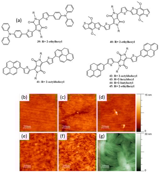 The incorporation of pi-stacking moieties as end groups would facilitate small molecules/oligomers to stack efficiently, leading to the enhancement in charge carrier mobility properties. In 2011, Fréchet and coworkers explored this idea by preparing seven small molecules consisting of diketopyrrolopyrrole (DPP) as the electron-deficient core [65]. DPP is known to provide solution-processability and film-state molecular ordering. The molecules were end-functionalized with various acceptors such as triphenylamine (39), BDT (40), and pyrene (41). Further, the effect of end-group symmetry was studied by preparing 42, where the regio-connectivity between pyrene and the chromophoric core was changed. To study the effect of alkyl chains on molecular packing and solar cell efficiency, the DPP unit of 42 was incorporated with 2-hexyldecyl (43), 2-butyloctyl (44), and 2-ethylhexyl (45). All the chemical structures of the oligomers are shown in Figure 16a. The blend film of 43 with PC71BM gave the highest photocurrent efficiency of 4.1%, whereas, lower efficiency was obtained for 39 (1.3%), 40 (1.7%), 41 (0.7%), 42 (2.7%) and 44 (3.0%). The molecule 45 had poor solubility for processing it into a device and hence its photovoltaic properties were not investigated. To understand the reason for the variation in photovoltaic performances of the molecules, the active layer morphology for all derivatives were studied by AFM (Figure 16b–g). The presence of relatively crystalline domains with sizes of ~10–30 nm was assumed for the better performances of 43 and 44.
