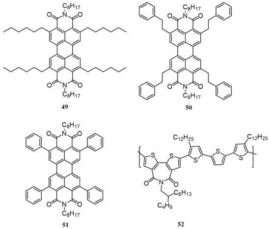 Due to the low-lying LUMO and high electron mobilities, perylenediimide (PDI) derivatives have been extensively used as an acceptor in OSCs for more than a decade [68,69]. However, PDIs give low PCE values because of the poor BHJ morphology. They have a strong tendency to stack through the extended pi-surfaces and resulting in large crystallites and macrophase separation in the bulk active layer. Moreover, PDI derivatives easily form excimers which act as traps for electrons thus reducing the overall efficiency. In order to get rid of these issues, twisted PDI dimers have been used by connecting the imide position through a hydrazine linker or by functionalizing the “bay positions”. Incorporation of bulky “swallow tail” PDI side chains at the imide position was also found to introduce twisting in the molecular packing [70,71,72]. Although adopting twisted PDIs have led to very high efficiencies, these too suffer from certain limitations. Completely preventing pi-pi stacking is not a possible solution to inhibit excimer formation since an absence of continuous pathway can lead to charge recombination. In this context, Wasielewski et al. in 2013 introduced a new method to inhibit the excimer formation by substituting suitably at C2, C5, C8, and C11 positions of PDI [73]. This arranges the molecules in a slip-stacked manner thereby inhibiting excimer formation without rupturing the pi-stacking interactions. This novel idea was then used to develop BHJ solar cells for which they synthesized three PDI derivatives 49, 50 and 51 with hexyl, phenethyl and phenyl side chains, respectively as acceptors and 52 as the donor polymer (Figure 18) [74]. Upon fabrication of the inverted solar cell, the blend of 51:52 gave the highest efficiency of 3.64%, while blends of 49 and 50 with 52 gave an efficiency of 0.65% and 1.20%, respectively. From the AFM analysis of the active layer, it was clear that the improved efficiency in the case of 51 was mainly due to moderate crystallinity and formation of micrometer-sized crystallites, while 49 forms the roughest and 50 forms the smoothest films.