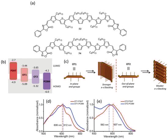 (a) The chemical structure of oligomers 53 and 54 as synthesized by Nair et al. [75]. (b) Scheme showing the comparison of the HOMO–LUMO levels of the oligomers with that of 18 and PC61BM (c) Simplified schematic representation of the supramolecular organization of 53 and 54 in the self-assembled state. Normalized absorption spectra of (d) 53 and (e) 54 blend films (1:1 w/w) with 18 or PC61BM spin-cast from chlorobenzene solution. Abbreviated by authors as following—53: OT1 and 54: OT2.