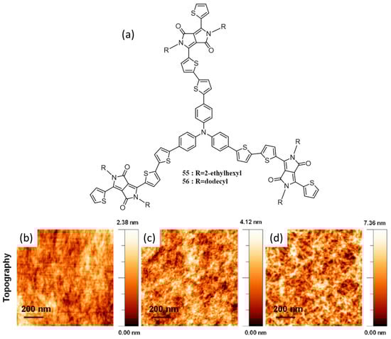 Several “star-shaped” donors with complex architectures (C-3 symmetric or tripodal) capable of forming self-assembled structures have been reported for photovoltaic applications with efficiencies surpassing 4% [76,77]. Stupp and co-workers have foreseen that the increased pi-pi stacking interactions in disc-like molecules would facilitate the formation of self-assembled fibers when appended with solubilizing alkyl side chains [78]. Very recently, they have designed and synthesized tripodal donor molecules, 55 (with 2-ethylhexyl) and 56 (with dodecyl), where electron-donating triphenylamine functions as the donor core and DPP units flanked by thiophene groups chosen as the chromophoric “arms” (Figure 20a). The films of the active layer were first investigated by AFM and 2D-GIXRD. 55 forms featureless films (Figure 20b) while 56 forms short nanowires when casting from chloroform solvent (Figure 20c). The self-assembly of 56 was further enhanced when casting from chlorobenzene while no enhancement in morphology was seen for 55 (Figure 20d). GIXRD results showed that 56 have a tendency to self-assemble with cofacial stacking to a greater extent than 55, which was well supported by the classical molecular dynamics simulation studies. AFM analysis showed that 56 forms small nanowires in chloroform, but forms featureless films after blending with PC71BM. This was attributed to two reasons; PC71BM disrupt the stacking of the donor and the use of highly volatile solvent chloroform did not provide the molecules enough time to stack efficiently. A combination of m-cresol and DIO promotes assembly of 56 into a well-dispersed network of nanowires, while the use of this solvent combination has increased the roughness in the case of 55. Solar cells were fabricated containing 55 and 56 using optimized weight ratios of donor/PC71BM of 1:3 and 1:2, respectively. Without any solvent additives, devices of 55 show higher performance than those of 56, with PCEs of 2.41% and 1.29%, respectively. With the addition of DIO, a significant improvement in the PCE (4.19%) was observed for 56, whereas, only marginal increase was observed for 55 (2.75%) under identical conditions. The performance of the molecules was further improved by the addition of 1.0 vol % of m-cresol as a solvent additive, which mainly functions as a dispersant. The fully optimized devices have a PCE of 4.39% for 56 and 2.91% for 55. The authors concluded that the use of linear alkyl chains rather than branched ones boosts supramolecular self-assembly in tripodal systems via pi-pi stacking, thereby bestowing a 50% improvement in device performance. In other words, the supramolecular assembly of 56 with linear alkyl chains creates ordered aggregates, while steric effects due to branched alkyl chain prevent 55 from stacking, thus forming amorphous domains with more structural defects that contribute to trap-mediated recombination.