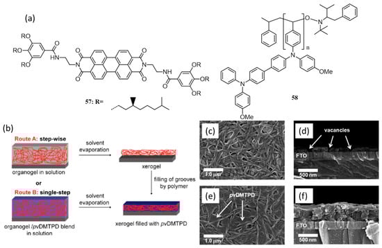The synergistic effects of hydrogen bonding and pi-pi stacking have been utilized in organic molecules for solar cell applications. In 2009, research groups of Würthner and Thelakkat made a nanostructured donor-acceptor interface of an n-type organogelator (57) with a p-type polymer (58) by combining hydrogen bonding and pi-pi stacking interactions, Figure 21a [79,80,81]. The nanostructures were prepared via two routes (Figure 21b); the first method (route A) involves the preparation of the organogel of 57 followed by removal of the solvent. The pores and grooves of the resulting xerogel were subsequently filled by the polymer, 58. The second method (route B) is a single-step process consisting of the blending of 57 and 58 yielding a three-dimensional network of the organogel of former embedded into an amorphous matrix of latter. In route B, blends of 57/58 were taken in three different ratios of 3:1, 1:1, and 1:3. The composition 3:1 delivered the highest current and power conversion values. The film morphology obtained via both routes was examined by SEM (Figure 21c–f), which showed the superstructure of 57-xerogel obtained via route A is highly entangled and aggregated. However, in route B, the amorphous polymer 58 occupies the vacancies in the xerogel of the blend film. The presence of polymer also prevents the formation of thicker gel strands resulting in high donor-acceptor interface. Films prepared by both methods were smoothened by doctor blading the surface using the polymer in chlorobenzene solution. To understand the importance of gelated network structure on charge separation and transport, devices were made using a non-gelating derivative of 57, N-(1-nonyldecyl)-N′-(1-pentylhexyl)-perylene-3,4,9,10-tetracarboxylic bisimide and measured its photovoltaic properties in combination with 58. This device gave an efficiency of 0.003%, while the xerogel sample gave the highest PCE of 0.04% via route B.