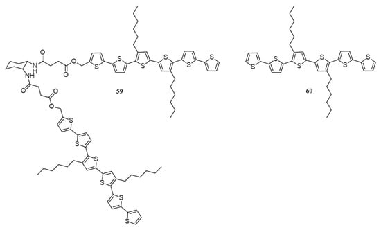 Hairpin molecules have the ability to form one-dimensional (1D) nanowires through pi-pi stacking and hydrogen bonding. These wires, with a grooved exterior, are known to provide high interfacial contact between donor and acceptor components [82]. Stupp et al. have synthesized a hairpin shaped gelator by connecting 1,2-cyclohexyldiamine having hydrogen bonding groups to a sexithiophene (59) self-assemble into 1D nanowires, Figure 22 [83]. The packing of the molecules will result in grooved nanostructures with void space, where small molecules like PC61BM get incorporated easily. At concentrations >0.5 wt %, the interpenetrated nanowires lead to the formation of gels in solvents such as toluene and chlorocyclohexane. Photovoltaic devices of 59 and PC61BM (40:60) in chlorobenzene gave the highest efficiency of 0.22% upon annealing at 80 °C, which decreased a little at 90 °C and drastically at 100 °C. Differential scanning calorimetry and optical polarizing microscope analysis suggested that the nanostructures melt at 109 °C and do not reassemble upon cooling. This irreversible change of 59 in higher temperature is attributed to the drop in efficiency. They later changed the acceptor to PC71BM, obtained an efficiency of 0.48% at 90 °C. The role of self-assembly in this system was studied by fabricating devices with dihexylsexithiophene (60). This linear molecule consists of the same oligothiophene moiety but devoid of hydrogen bonding units. The PCE of the devices without annealing was 0.32%, which was similar to the 59/PC71BM devices. Upon annealing at 80 °C, the efficiency increased to 0.39% but further increase in temperatures drastically decreased the efficiency as in the case of 59. However, the mean PCE of 59 was 0.42%, whereas, the mean PCE of 60 was 0.36%. Welch’s unpaired t-test at the 1% significance level proved the difference in mean between 59 and 60 was statistically significant. This work signifies the importance of grooved structure, which promotes receptor-ligand type configurations in bulk heterojunctions and improves device efficiency.