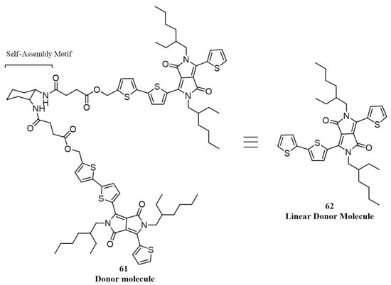 The same group has reported another hairpin-shaped molecule consisting of trans-1,2-diamidocyclohexane as core and DPP as the arm (61) having a chemical structure given in Figure 23 [84]. Self-assembled nanowires were prepared through a step-wise cooling process with minimal stirring of solutions. The fabricated devices of the nanowires with PC71BM (1:1 wt %) as acceptor showed an optimized efficiency up to 0.53%, which was significantly higher than those of devices prepared by simple mixing of donor and acceptor molecules. For comparison purposes, the authors have made cells using a linear molecule that contains the same arm of the hairpin molecule (62), which gave an efficiency of only 0.24%. Therefore, synergistic action of hydrogen bonds and pi-pi stacking in donor molecules that created long nanowires by self-assembly results in devices that are more efficient than those built with analogous donor molecules containing only the conjugated structure.