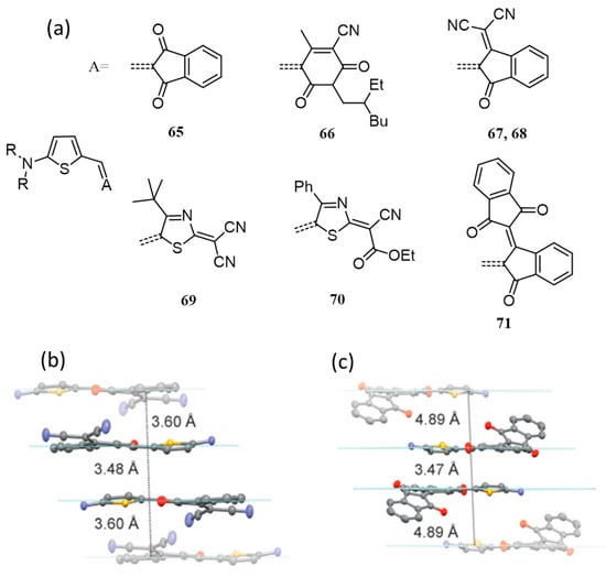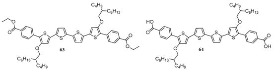 Dicarboxylic acid is an excellent end-functional group for enhancing intermolecular connectivity and crystallinity in solution-processable conjugated small molecules. As a proof of concept, quarterthiophenes end-functionalized with diester (63) and diacid (64) groups were synthesized by Lam and co-workers (Figure 24) and studied their photovoltaic properties [85]. The idea of using an acid end group is that it may result in strong hydrogen bonding which may assist pi-pi stacking between the oligomers. Consequently, the formation of a pseudo-polymer may happen, which was expected to improve the charge transport among the chains and enhance the efficiency of diacid in comparison with diester. In the film state absorption studies, an extended red-shift absorption in the visible region was observed in 64 with reference to 63, which is an indication of hydrogen bond induced pi-pi stacking in the molecule. The enhanced pi-pi stacking was also evident in the thermogravimetric analysis studies as 64 exhibited higher thermal transition temperatures than that of 63. Solar cells were fabricated using 63 and 64 as donors and PC61BM as acceptor. 63 exhibited an efficiency of 0.39% for films fabricated from chlorobenzene and 0.42% for films from o-dichlorobenzene. For 64, a solvent mixture of THF and DMF was used as the molecule has poor solubility in chlorinated solvents, and the PCE was 0.91%.