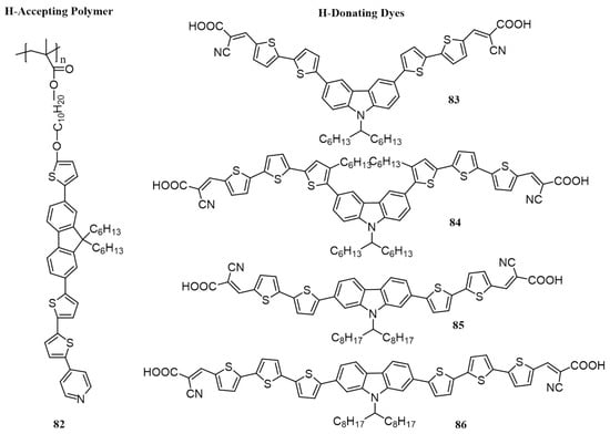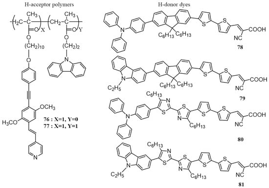 - Sahu, D.; Padhy, H.; Patra, D.; Kekuda, D.; Chu, C.; Chiang, I.; Lin, H. Synthesis and Application of H-Bonded Cross-Linking Polymers Containing a Conjugated Pyridyl H-Acceptor Side-Chain Polymer and Various Carbazole-Based H-Donor Dyes Bearing Symmetrical Cyanoacrylic Acids for Organic Solar Cells. Polymer 2010, 51, 6182–6192. [Google Scholar] [CrossRef]