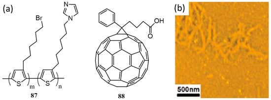 (a) Chemical structure of P3HT (18) and fullerene derivatives (19–21) synthesized by Li et al. [55]. AFM height images of cells fabricated from o-dichlorobenzene solution with the ratio of 1:4 of (b) 18/20 (c) 18/21 with 2.5% 1,12-diiodododecane by weight. Adapted with permission from Ref. [55] Copyright 2009 American Chemical Society.