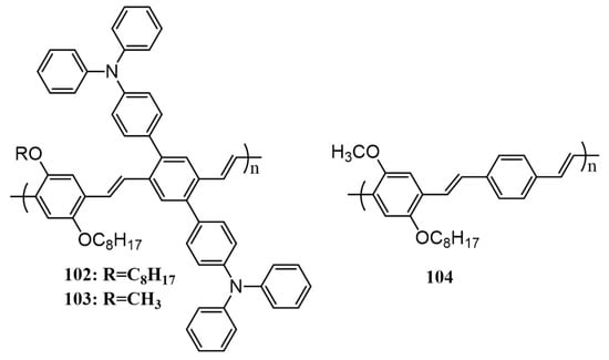 - Shen, P.; Sang, G.; Lu, J.; Zhao, B.; Wan, M.; Zou, Y.; Li, Y.; Tan, S. Effect of 3D Pi-Pi Stacking on Photovoltaic and Electroluminescent Properties in Triphenylamine-Containing Poly(p-phenylenevinylene) Derivatives. Macromolecules 2008, 41, 5716–5722. [Google Scholar] [CrossRef]