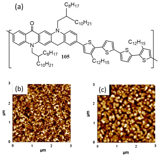 (a) Chemical structure of 23 synthesized by Patil et al. [57]. AFM images of 23 (b) without and (c) with PC61BM. Adapted with permission from Ref. [57] Copyright 2013 American Chemical Society.