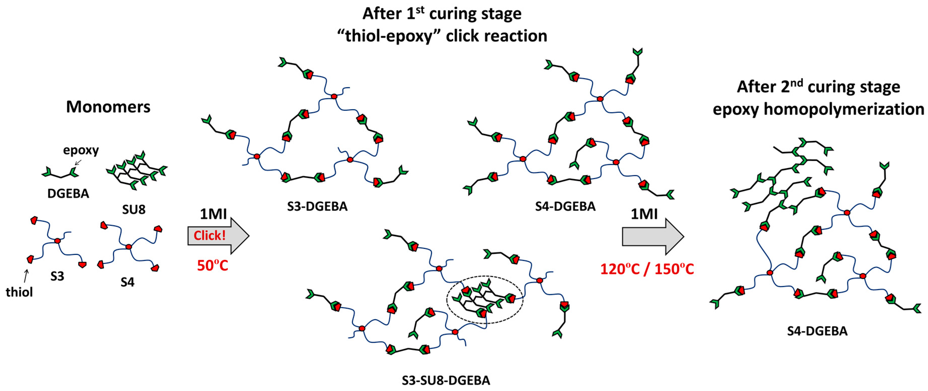 - Fernández-Francos, X.; Konuray, A.-O.; Belmonte, A.; De la Flor, S.; Serra, À.; Ramis, X. Sequential curing of off-stoichiometric thiol–epoxy thermosets with a custom-tailored structure. Polym. Chem. 2016, 7, 2280–2290. [Google Scholar] [CrossRef]