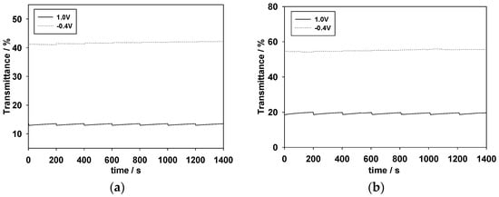 The optical memory effect is also important for ECD applications [40]. The optical memory of the PMPS/PProDOT-Et2, PMPO/PProDOT-Et2, and PANIL/PProDOT-Et2 ECDs was evaluated at 590, 626, and 628 nm, respectively, with the function of time at −0.4 V and +1.0 V by applying a potential for 1 s for each 200 s time interval. As shown in Figure 11a–c, the PMPS/PProDOT-Et2, PMPO/PProDOT-Et2, and PANIL/PProDOT-Et2 ECDs showed good optical memories in a reduced state of the PMPS, PMPO, and PANIL films, and the transmittance change of the PMPS, PMPO, and PANIL films is less than 1% in their reduced states. However, in the oxidized state of the PMPS, PMPO, and PANIL films and in the reduced state of the PProDOT-Et2 film, the PMPS/PProDOT-Et2, PMPO/PProDOT-Et2, and PANIL/PProDOT-Et2 ECDs are less stable than the oxidized state of the PProDOT-Et2 film, but the transmittance change is less than 3% in the oxidized state of the PMPS, PMPO, and PANIL films, demonstrating that the PMPS/PProDOT-Et2, PMPO/PProDOT-Et2, and PANIL/PProDOT-Et2 ECDs show reasonable optical memory in the coloring and bleaching states.