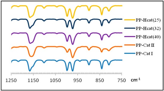 The absorption band at 973 cm−1 is observed both in i-PP and a-PP with almost constant intensity. However, the intensity of the 998 cm−1 absorption band differs for these polymers. For this reason, the 973 cm−1 band is used as an internal reference while the A998/A973 ratio is used as the isotacticity index for PP. The intensity of the 998 cm−1 absorption band is proportional to the concentration of isotactic segments in PP chains. A decrease of an increase in the A998/A973 ratio is an indication of the reduction or enhancement of PP tacticity [41]. From the results presented in Table 3, it is obvious that the sample produced by catalyst (I) (PP-Cat I) is a PP with very high tacticity which shows FTIR bands typical of a commercial i-PP. Moreover, PP-Cat II is a PP with low tacticity content, exhibiting a band at 998 cm−1 with highly reduced intensity which is due to an inherent characteristic of catalyst (II) in producing polymers with large atactic blocks (segments).