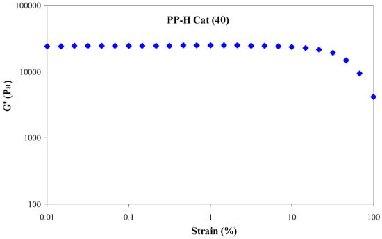 The strain sweep test was reported for the PP-H Cat (40) sample since it has the highest MW among all samples. For this sample, it is shown that the strain of 5% safely falls within the linear viscoelastic region. The other samples which have lower MWs than the mentioned sample surely remain in the linear viscoelastic region at a strain of 5%.