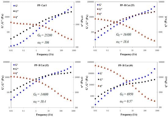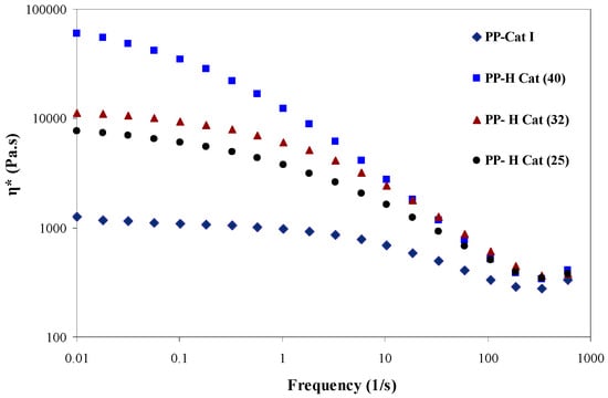 Figure 4 shows the storage modulus (G’) values, which are illustrated as a function of frequency within the linear viscoelastic region for the synthesized PPs using binary metallocene catalysts at different molar ratios of II/I (25, 32 and 40). According to this figure, the storage modulus values exhibit a rather similar variation trend for different samples within the whole frequency range. Moreover, all samples exhibit a modulus upturn at the low frequency region; similar to what is observed for the viscosity versus frequency curves presented subsequently [44,45,46]. Within the whole frequency range, the G’ values were found to be increased for all the synthesized PPs upon increasing the content of catalyst (II); albeit the majority of variations are observed within the low-frequency region. The observed plateau within the low-frequency region, which is associated with the solid-like behavior of the synthesized PPs induced by varying the composition of catalysts, is not observed for all the samples. As the molar ratio of II/I increases (from 25 to 40), the storage modulus within the low-frequency region exhibits a notable enhancement which could be attributed to the increased levels of MW and amorphous blocks in the synthesized PPs. These mentioned factors are themselves originated from the mixing of catalysts and their mutual effects on each other [47].