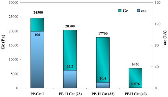 According to Figure 8, as the molar ratio of catalysts increases from 25 to 40, Gc and ωc are changed from 24,500 and 106 to 6950 and 0.57, respectively. It can be concluded that with changing the molar ratio of II/I, the cross-over modulus and frequency are both decreased. The reason for the observed phenomenon could be ascribed to the higher elasticity of polymer melt due to the increased MW and also formation of amorphous blocks along the polymer chains [50].