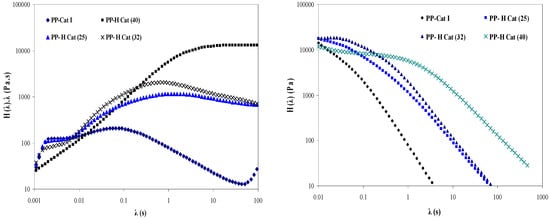 In Figure 9 and Figure 10, the relaxation spectra are illustrated in terms of λ within the linear viscoelastic region for the PP blends synthesized at different molar ratios of II/I. As the molar ratio of catalysts changes, all the samples exhibit an individual relaxation time peak which is shifted towards longer relaxation times with increasing the molar ratio of catalyst (II). Based on the obtained results, the PP-H Cat (40) sample exhibits the longest relaxation time (19.6 s) among the samples. The same trend is observed for the relaxation spectra of PP-H Cat (32) and PP-H Cat (25), and their relaxation times are 4.6 and 1.34 s, respectively.