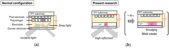 As a significant alternative to the conventional configuration of EC displays, a new simple structure with an EC layer formed on the opposite side of the TFT substrate has been recently proposed (Figure 1b) [21,22]. The configuration gave remarkable advantages over conventional one: the highest reflectance of light beyond 70% was achieved for electrochromic cells due to the smaller loss of stray light in the device. Sub-millimeter pixels were easily realized without etching the EC materials. Further, a full color display was also fabricated by using a tandem EC layers. However, the most serious problem of the configuration is that unexpected pixel smudging tends to occur in the region where no voltage is applied. The smudging seems to be caused by charge transport through the EC materials to the open circuit part, but the reason for bleeding and the countermeasure have not been revealed yet, which has prevented the wide commercialization of the EC displays.