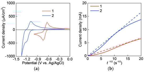 (a) Cyclic voltammograms for thin layers of 1 and 2. Scan rate was 50 mV/s; (b) Cottrell curves for 1 and 2. A potential pulse from −1.2 to 0 V vs. Ag/AgCl was applied. 1 M LiTFSI aqueous solution was used as electrolytes.