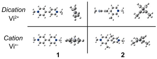 Estimated molecular structures for 1 and 2 in dication and cation states of bipyridine units. Density functional theory (DFT) calculation was used for structure optimization.