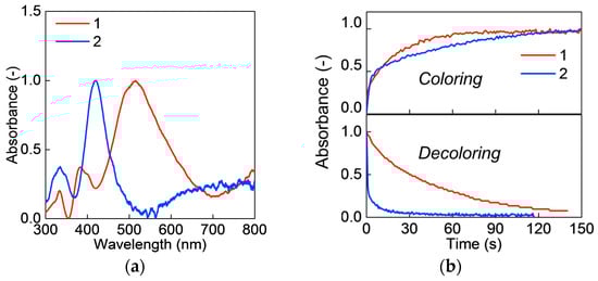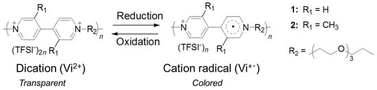 Redox-active polymers have been attracting considerable attention as the key components of various energy-related devices such as charge storage devices, displays, memories, and solar cells due to their splendid electrochemical characteristics [1,2,3,4,5,6,7,8,9]. In particular, electrochromic (EC) polymers represented by polyviologens, polythiophenes, and metallopolymers show high contrast accompanied with reversible redox reactions [3,9,10,11,12,13,14,15,16,17,18]. The polymers were studied as the candidates for wet-processable [19] materials for displays and smart windows. The EC materials usually retain their coloring states even under the open circuit condition, enabling the low power consumption characteristics (i.e., memory effect), which is a significant contrast to liquid crystal and organic light-emitting diode displays [10,11,20]. The absorption wavelength was tuned by introducing substituent to redox-active units, changing conjugation length, and substitution of heteroatoms or metals in case of polythiophenes and metallopolymers [11,12,13,14,15]. Such color tunability and the potentially high reflectance of the EC cells (>70%) [21,22] could be regarded as one of the important advantages against conventional electronic papers (e-papers) [23,24,25]. Still, the color of the polyviologens has been limited to typically violet whilst tuning of chemical structures was common with the low molecular weight compounds [11,26,27,28,29,30,31].
