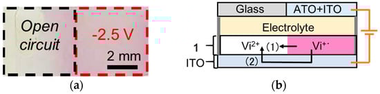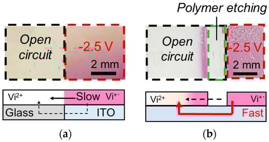 In order to fabricate electrochromic display with pixels based on the schematic in Figure 1, as a preliminary step, we evaluated the cells in which the left half of the counter electrode was etched (Figure 5). In this configuration, the electrochemical reaction could proceed preferentially only in the right half region to which the voltage was applied. Electrical charge of the polymer must not propagate to the left half, open circuit region to achieve high-resolution of the devices. Here, polyviologen 1 was applied as the electrochromic polymer (2 was also tested in the last section). When 1 M LiCF3SO3 in γ-butyrolactone (GBL) was applied as one of common electrolyte solutions, the coloring reaction even progressed to the open circuit region after applying the voltage in 30 s. We suspected that bleeding was caused by (1) electron self-exchange in the polymer and/or (2) charge transfer through the ITO substrate (Figure 5b) because they were the main processes for organic-based electrodes [7]. The “fringing effect” of the electric field [41] could not be the main reason for the smudging (Figure S1, see Supplementary Materials for further discussion).