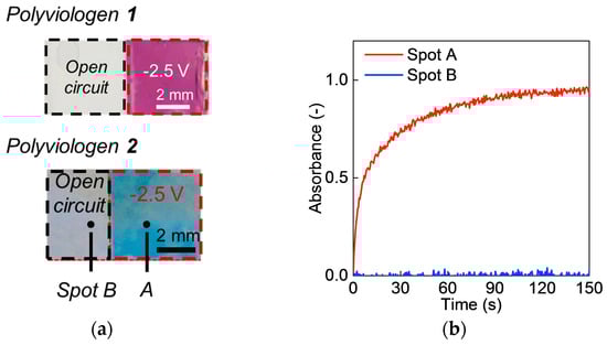 (a) Photograph of electrochromic cells containing 35 mM EMIM TCB in 5CB as electrolyte solution. The cell configuration is shown in Figure 5b; (b) Time dependence of absorbance at spot A and B (wavelength: 420 nm).