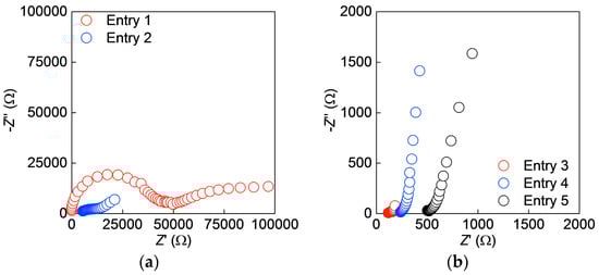 For the elucidation of the factors contributing to the suppression of charge transfer through ITO, the ionic conductivity and solvent viscosity of the electrolytes, and the exchange current density i0 of the EC electrodes were analyzed (Table 2). The representative cases in Table 1 were tested. Exchange current density was estimated by analyzing charge transfer resistance during AC impedance measurements (Figure 8). Ionic conductivity and viscosity showed no clear relationship with the smudging phenomena although the two factors normally affect the rate of electrochemical reaction [34,43]. In contrast, significantly smaller exchange current density of 100 μA was obtained in the case of alkylbenzene compounds, which suppressed the smudging (Entry 1–2). The current was 103 times smaller than the other conditions. Since charge transfer to the open circuit region proceeded through the ITO substrate, small i0 must be necessary for the realization of pixels. We note that fast response of the electrochromic devices could also be achieved even with the electrolytes of small i0 as demonstrated by the fast decoloring of polyviologen 2 (<10 s, Figure 4b, Entry 1). Elucidation of the factors giving small i0 and fast response of the electrodes, taking into account the condition of inner Helmholtz layer and anisotropy of the field [3,44], are of future interest to us.