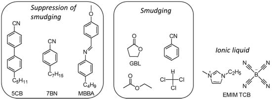 Next, we screened the electrolyte solution which could suppress charge transfer even via ITO, using the normal device configuration shown in Figure 5 (Table 1, Scheme 3). Bleeding was suppressed by applying alkylbenzene compounds containing polar groups such as 4-cyano-4′-pentylbiphenyl (5CB), 4-heptylbenzonitrile (7BN), N-(4-methoxybenzylidene)-4-butylaniline (MBBA) as organic solvents with a small amount of ionic liquid, 1-ethyl-1-methylpyrrolidinium tetracyanoborate (EMIM TCB, 35 mM) (Entry 1–3, photograph shown in Figure 7a). 5CB and MBBA have been reported as typical nematic liquid crystals [42] whilst 7BN gave no anisotropy. EMIM TCB was selected as electrolyte salt due to its high miscibility with these solvents [3].