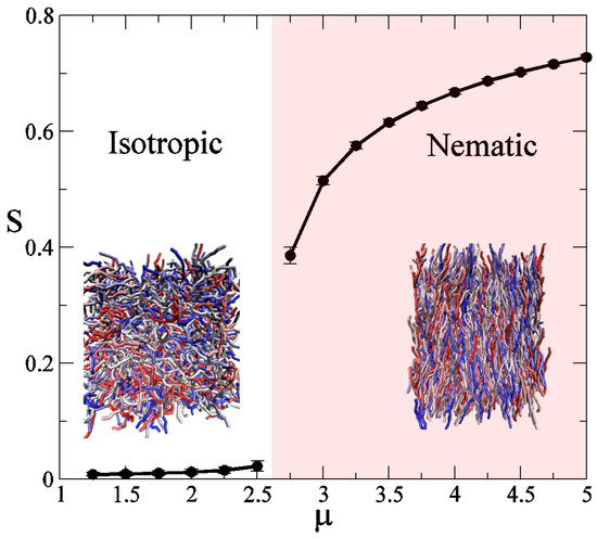 Figure 1 illustrates the behavior of a liquid crystalline polymer melt with segments per chain. For this example, , which corresponds to a persistence length of approximately . As can be seen in Figure 1, at small values of the orientational coupling, μ, the system displays an isotropic phase where chains are in a disordered state, with a global order parameter . However, there is a parameter value, , above which the global order parameter . The abrupt transition of this order parameter at is a signature of a first order phase transition, in this case between an isotropic and a nematic phase; the insets in Figure 1 show two instantaneous configurations of such phases. For clarity, we have unwrapped polymer positions from the simulation box. It should be noted that the isotropic-nematic transition does not entail a high degree of order (large S values), in agreement with experimental observations [40]. Note that in the first study our estimation of the orientational coupling at the transition, , is not rigorous. Formally, more demanding free-energy calculations are needed to determine those values accurately as well as the order of the corresponding phase transition. Given that we use a finite set of equally spaced μ values, with spacing , we approximate as the middle point between the largest value that gives , and the smallest value with , i.e., . Our simulations suggest a first order phase transition, and this agrees with the corresponding transition in small molecule liquid crystals, but more importantly, this also agrees with simulation results for semi-flexible polymers using a microscopic, Lennard-Jones-type model and mean-field predictions [41,42].