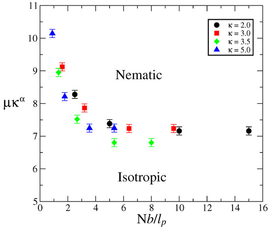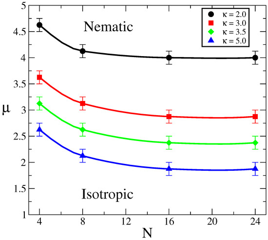 Phase diagram in the parameter space (μ, N) for different degrees of flexibility, parametrized by κ, obtained by Monte Carlo simulations. Symbols indicate the transition values, , at which the isotropic-nematic transition occurs. Lines are only a guide to the eye. The associated persistence lengths, from small to large κ values, are: and .