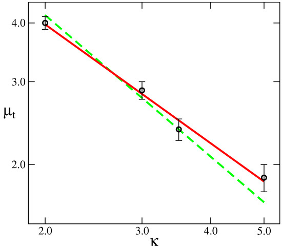 Relationship between the orientational coupling at the I-N transition, , and the degree of flexibility, parametrized by κ, obtained by Monte Carlo simulations (symbols) at . Green (dashed) line is the mean field prediction in the limit of very large N, . The red (continuous) line is a fit to a power law , with exponent .