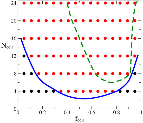 Phase diagram in the parameter space (, ) for a mixture of rigid and flexible polymers, obtained by Monte Carlo simulations. Red circles indicate the points in the phase diagram that give rise to phase separated samples while black circles represent those conditions for which a single phase is obtained. Lines are only a guide to the eye and highlight the phase boundary, these lines were obtained by using splines on the simulation data. Symbols and continuous (blue) line are results for (), () and . The dashed green line is the phase boundary obtained for a sample with less dissimilarity between polymers, characterized by (), and .