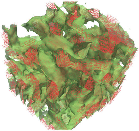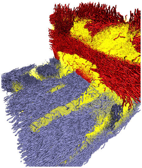 When macrophase separation occurs the system organizes into nematic and isotropic domains (this has been also observed experimentally, see for example Ref. [43]). As the initial configurations were homogeneous, and simulation box sizes are relatively large, we observe the local arrangement of stiff polymers into bundles with nematic order (nematic domains), without large-scale phase separation. The orientation of such nematic domains was, as expected, random. When the volume fraction of the stiff macromolecules was large enough, those nematic domains formed a percolating network through the whole sample (see Figure 6). To highlight this structure we have computed the local composition scalar field, , defined by