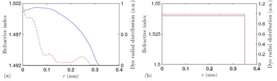 Refractive-index profiles (blue solid lines) and dye radial distributions (red dashed lines) in the fiber core obtained for the thermoplastic POF (a) and for the thermosetting POF (b).