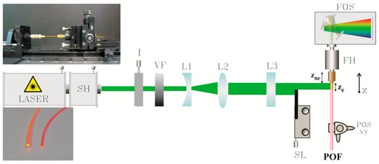 Experimental set-up for the measurement of the ASE and the fiber gain using the VSL method. Legend: SH: second harmonic generator; I: iris; VF: variable filters; L1: divergent lens; L2: convergent lens; L3: cylindrical lens of f´ = +15 cm; SL: sliding blade; POSxy: micro positioner; FH: filter holder; FOS: fiber-optic spectrometer. Top inset: photograph of a fiber in the experimental set-up. Bottom inset: photograph of the thermoplastic fiber (left) and of the thermosetting one (right).