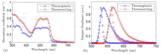 The absorption spectra of our two types of R6G-doped POFs are shown in Figure 3a. In both cases, there is a strong wide absorption band that extends in the green region of the spectrum, corresponding to the transition from the ground singlet state S0 to the excited singlet state S1. As also happens in some other R6G-doped PMMA systems, the absorption bands present a flattened shape due to the contributions of dye monomers and aggregates [30]. A much weaker absorption band is detected around 350 nm, which is only noticeable in the thermoplastic POF, since, in the thermosetting fiber, it is hidden by the ultraviolet tail of the absorption curve of the host material. This weaker band corresponds to the transition from S0 to the excited singlet state S2. Notice that the absorption spectrum of the thermosetting fiber is located at slightly longer wavelengths than that of the thermoplastic fiber. The values of the attenuation coefficients at wavelengths outside the absorption band of the dye most probably stem from the contribution of light scattering in the fiber core. Since the lengths of our measured fibers are very short (about 1 cm), the power mode distributions of the fibers have not yet reached the equilibrium condition, so the attenuation coefficients at those wavelengths may be higher than those obtained by using long fibers, as demanded by the standard cut-back method. Figure 3b shows the fluorescence and ASE spectra when the fibers are excited transversely at 532 nm, which correspond to the transition from the excited state S1 to the ground singlet state S0. The ASE spectra, obtained by pumping the fibers above the threshold value, are the narrowed bands in the figure. It can be observed that both the fluorescence and the ASE curves of the thermosetting POF, with a higher dopant concentration, are located at longer wavelengths (about 30 nm) than the corresponding curves of the thermoplastic POF, with a lower dopant concentration (see Table 2). Additionally, it can be observed that the fluorescence spectrum of the thermosetting POF is broader than that of the thermoplastic POF. This spectral location at longer wavelengths and the broader spectrum in the case of the thermosetting POF could be explained by its higher dye concentration. It is known that dopant molecules tend to link to one another when the dye concentration is higher than a certain maximum level, thus creating dopant aggregates and, consequently, making the emission bands shift toward longer wavelengths [31]. In this respect, the crosslinked chains of the thermosetting polymer favor the appearance of dye aggregates when the dopant concentration is high enough [32].
