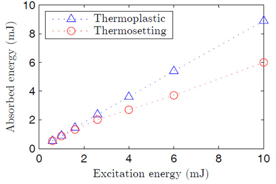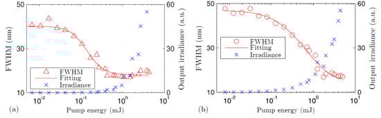 Figure 4 illustrates the spectral narrowing and the abrupt increase in the output irradiance that occurs when the pump energy becomes higher than the ASE threshold. Due to gain-saturation effects, the spectral widths never become narrower than a certain value, and the curves of the full width at half maximum (FWHM) tend to become rather horizontal when the pump energy is high enough. The ASE threshold has been estimated as the pump energy at which the spectral FWHM of the emission spectrum decays to half of its maximum value [33]. As can be observed in the figure, the threshold is higher in the case of the thermosetting fiber (see Table 2 for the exact values). This fact could be due, in part, to the lower pump energy that is absorbed by the thermosetting fiber, as shown in Figure 5, where it is also noticeable that there is a greater tendency for absorption saturation at high pump energy to occur in this fiber, possibly due to phenomena such as excited-state absorption, energy transfer to triplet states, and so on. On the other hand, the aggregation of dye molecules at high concentration—such as that of the thermosetting POF—reduces the effective surface area of the dopant and hence its absorption cross section. This reduction has been attributed to the mutual interaction of neighboring molecules [34]. Besides, the fact that the overlapping factor γ is smaller and the core diameter is greater in our thermosetting POF could also contribute to its higher threshold energy [18].