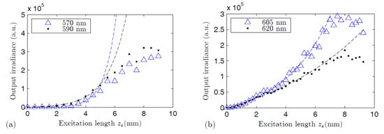 Output irradiance from the thermoplastic POF (a) and from the thermosetting POF (b) measured at two different emission wavelengths in each case: 570 and 590 nm in the case of the thermoplastic fiber, and 605 and 620 nm in the case of the thermosetting fiber one. The pump irradiances are 6 and 30 mJ·cm−2, respectively. ze,max = 0.92 cm in both cases. The dashed lines are the fittings using Equation (1).