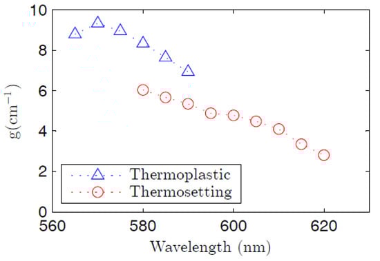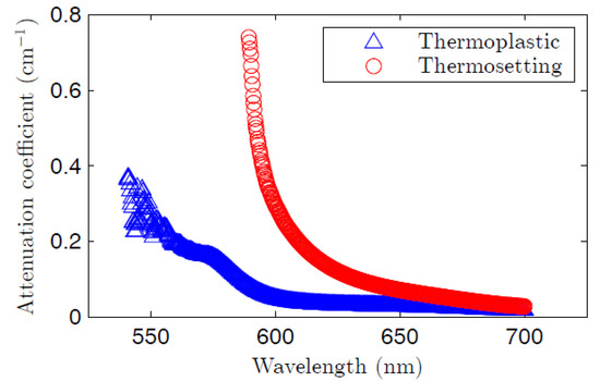In Equation (2), I0(λ) is the light irradiance measured at zne = 0 at a certain wavelength λ, and α(λ) is the linear attenuation coefficient at that wavelength. Figure 9 shows the linear-attenuation coefficients obtained for the two fibers by fitting experimental curves I(λ,zne) for several wavelengths to Equation (2) [20,37]. In agreement with Figure 3a, the highest values of the attenuation curve in the range of wavelengths considered correspond to the thermosetting POF. In the region where the dye absorption tends to be negligible, i.e., above 650 nm, the attenuation of the thermosetting fiber is slightly higher. This result could be due to the light-scattering effect of the dye aggregates, and also to the fact that host materials with higher melting temperatures, as is the case of the thermosetting host, tend to present higher propagation losses [17,38]. Also in the case of non-doped fibers, the attenuation coefficient of undoped thermosetting POFs is typically higher than that of undoped PMMA POFs (on the order of 1500 and 400 dB/km, respectively, at 700 nm) [2,39]. In both types of fibers, the attenuation coefficients are always much smaller than the gain coefficients (see Figure 7).