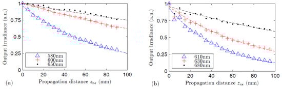Output irradiance as a function of the propagation distance for the thermoplastic POF (a) and for the thermosetting POF (b) at three different emission wavelengths: 580, 600, and 650 nm for the thermoplastic fiber, and 610 , 630, and 680 nm for the thermosetting fiber. The dashed lines are the fittings to Equation (2). The excitation wavelength in both cases is 520 nm with 22 nJ·cm−2 of irradiance.