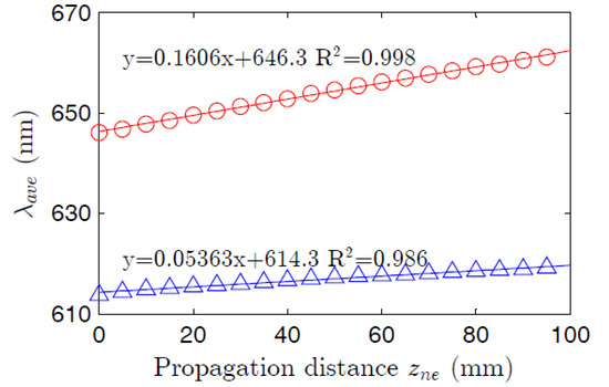The average emission wavelengths of the fluorescence curves in Figure 10 are shifted linearly toward longer wavelengths as zne is increased, which is due to reabsorption and reemission effects [37]. Figure 10 shows this shift for both types of fibers. The curves in Figure 10 present a linear behavior, but with different slopes: 0.054 nm/mm for the thermoplastic POF and 0.16 nm/mm for the thermosetting one. This linear spectral shift with length enables the manufacture of tunable light sources, and it could also be useful for the design of displacement sensors using doped fibers. For this purpose, the greater slope of the thermosetting POF would be advantageous.