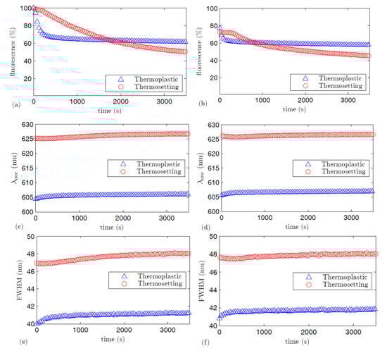 The values of these constants were obtained from the fittings, and the corresponding coefficients of determination R2 are shown in Table 3. The values of τ1 and τ2 shown in Table 3 corroborate that the thermoplastic fiber undergoes the fastest degradation at the beginning of the excitation period, but the steady state is achieved relatively fast. Specifically, the thermoplastic fiber achieves an approximately steady state after 5 min of exposure, as can be seen in Figure 11a. In the case of the thermosetting fiber, the fluorescence irradiance is not much affected during the first 3 min, maintaining its emission capacity almost at 100%. However, after this short excitation period, the emission irradiance diminishes steadily during the rest of the excitation time without reaching any steady state.