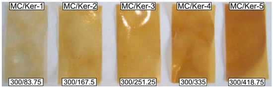 The interaction between the protein- and the polysaccharide-based component is investigated by systematically changing the incorporated amount of polypeptides. Various amounts of polypeptide solution are added to the ethanol/water mixture containing 20 mg·mL methyl cellulose. The solutions are miscible in all investigated ratios, resulting in homogeneous mixtures without any traces of precipitates. Films are casted from these solutions, resulting in calculated methyl cellulose to keratin hydrolysate () ratios of 300/83.75 (MC/Ker-1), 300/167.5 (MC/Ker-2), 300/251.25 (MC/Ker-3), 300/335 (MC/Ker-4), and 300/418.75 (MC/Ker-5), as described above (Equation (2)).