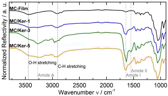 For further information on how the polypeptides interact with the cellulose derivative, FTIR measurements are carried out. In Figure 3, the spectra of the composite membranes are displayed. A film consisting of pure methyl cellulose is used as reference sample whose absorption peaks can be assigned to peaks known from literature [17,18,19,20]. This includes, among others, the bands for the O–H stretching vibration at approximately 3444 cm and the C–H stretching vibration around 2903 cm.