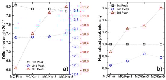 The WAXD patterns obtained from the composite membranes are comparable to the pattern of the neat methyl cellulose film. The first peak is present in all investigated compositions with a 2θ position between 7.90 and 7.95°, close to that of neat methyl cellulose. The presence of the second peak between 13.21 and 13.31° in all investigated membranes proves that the developed film casting route in general leads to a more hydrated methyl cellulose structure. In contrast to the first two peaks—whose position remains almost unchanged—the third peak in the WAXD patterns of the composite films is distinctly influenced by the addition of the polypeptides. Its position shifts systematically from 19.85° for the neat methyl cellulose film up to a diffraction angle of 21.21° for sample MC/Ker-5 as depicted in Figure 5a. Furthermore, the peak shape becomes more asymmetric with increasing keratin hydrolysate fraction, as shown in the WAXD patterns in Figure 4.