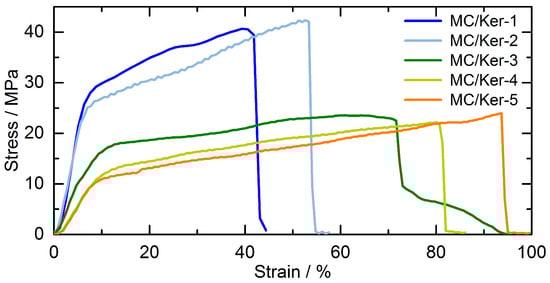 Stress–strain diagrams of composite membranes with various methyl cellulose/keratin hydrolysate () ratios. Glycerol (25 L) was added as plasticizer to the solutions for the film casting.