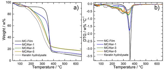 Thermogravimetric analysis (TGA) was performed on a PerkinElmer STA 6000 with heating rates of 10 K·min. Nitrogen was used as purge gas with a flow rate of 20 mL·min. Around 5–10 mg sample mass was heated in open alumina crucibles from room temperature to 650 °C. The first derivative of the TG signal (differential thermogravimetric curve (DTG)) was calculated. The analyzed keratin hydrolysate resulted from a treatment at 220 °C for 120 min with an initial feather to water ratio of 250 mg·mL. The characterized films were produced as described above and consisted of methyl cellulose, keratin polypeptides, and 25 L glycerol as plasticizer.