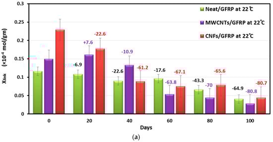 𝜌 is the density of the polymer composite, E′ is the storage modulus at temperature 50 °C above the glass transition temperature (Tg + 50), R is the gas constant, and T is the temperature equal to (Tg + 50). Figure 11a,b shows the estimated degree of crosslinking of Neat/GFRP, CNFs/GFRP, and MWCNTs/GFRP coupons immersed at temperatures 22 and 45 °C respectively.