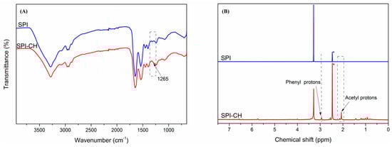 (A) FT-IR spectra SPI and SPI-CH powder; (B) 1H NMR spectrum of SPI and SPI-CH in DMSO.
