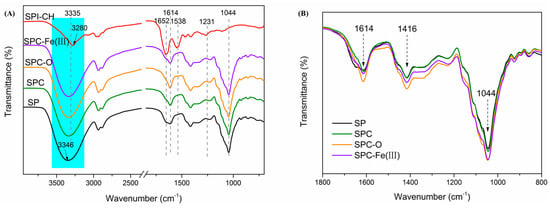 To further investigate the H-bonding interactions among SPI-CH and SP chains under different cross-linking conditions, amplification FT-IR spectra (1800 to 800 cm−1) were gathered as shown in Figure 2B. After the addition of the SPI-CH conjugates, the absorption band intensities at 1614 and 1044 cm−1 increased slightly, indicating that the SPI-CH chain segment was engaged in protein via physicochemical crosslinking [13]. Compared to the SPC film, the increase in absorption peak intensity in the SPC-O and SPC-Fe(III) films was more distinct; this was likely due to the oxidative coupling and multivalent coordination of catechol and/or quinone groups in SPI-CH with the unique crosslinked network structure [28,38]. The FT-IR results helped us to determine that the crosslinked soy-based films composed of SSPS and SPI-CH were formed via effective H-bonding interactions, as opposed to the control.